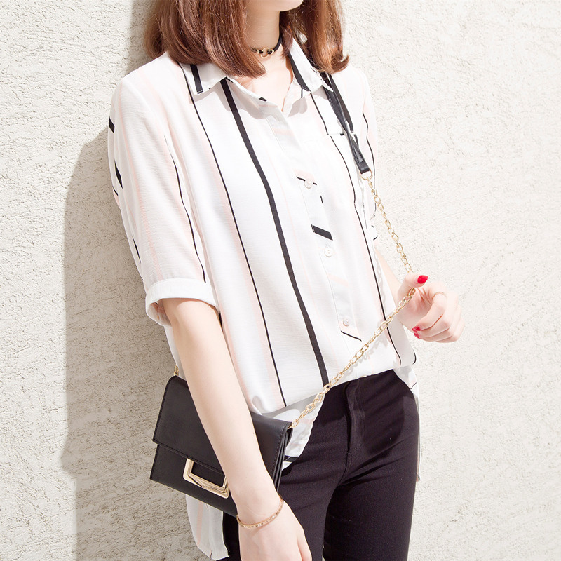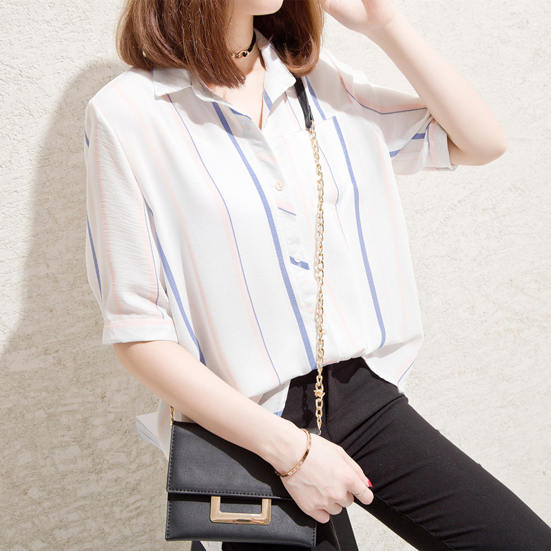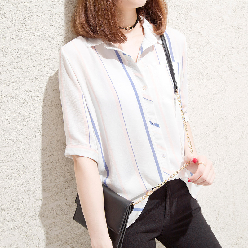/ 條紋白襯衫女甜美上衣小清新港味雪紡襯衣半袖韓范女夏裝新款