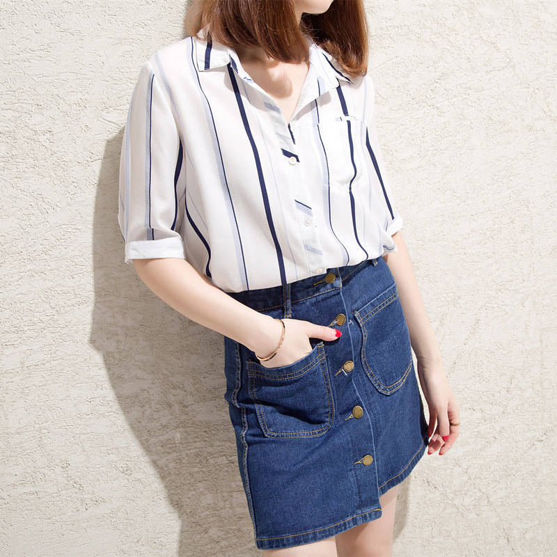 條紋白襯衫女甜美上衣小清新港味雪紡襯衣半袖韓范女夏裝新款