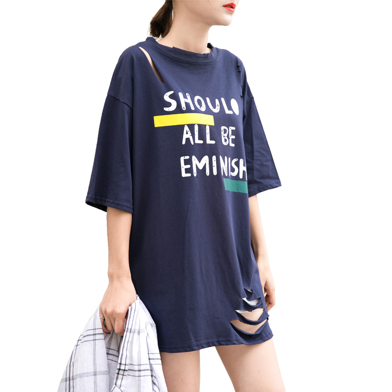 / 韓范新款女裝寬松大碼中長款半袖上衣破洞字母圓領短袖T恤衫