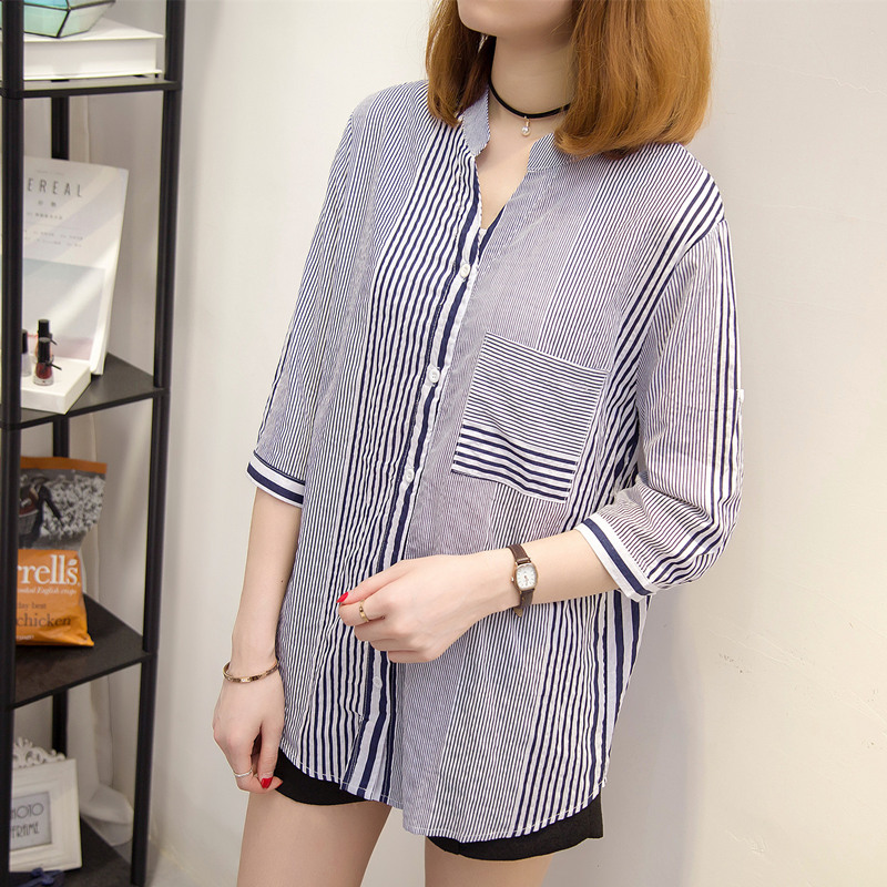 條紋襯衫女甜美上衣小清新韓范半袖不規則格子襯衣女chic襯衫外套