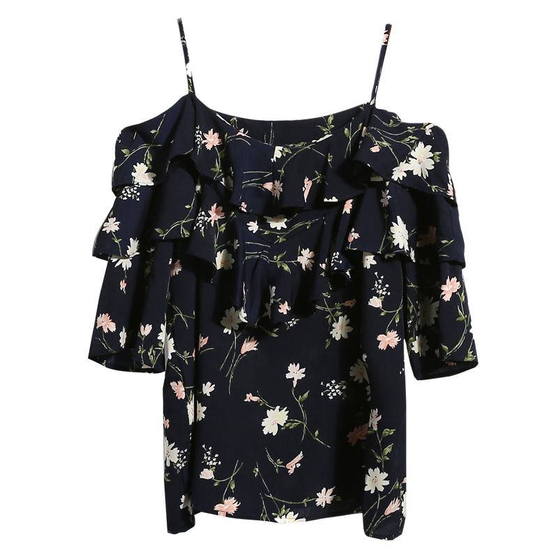 / 雪紡衫短袖夏季新款甜美荷葉邊吊帶一字肩露肩顯瘦碎花上衣女