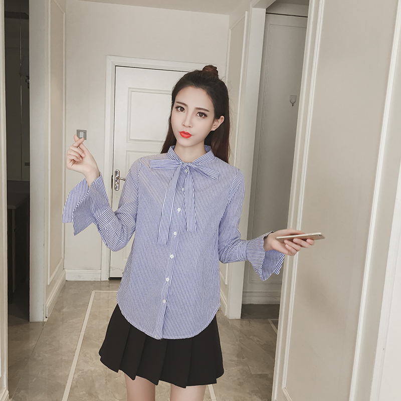 / 春新款女裝韓版蝴蝶結條紋襯衫女長袖雪紡襯衣喇叭袖百搭上衣