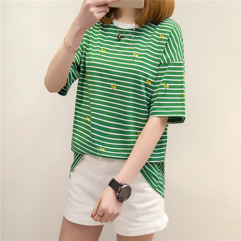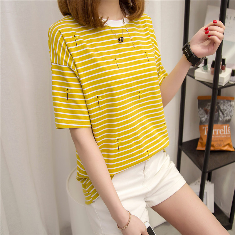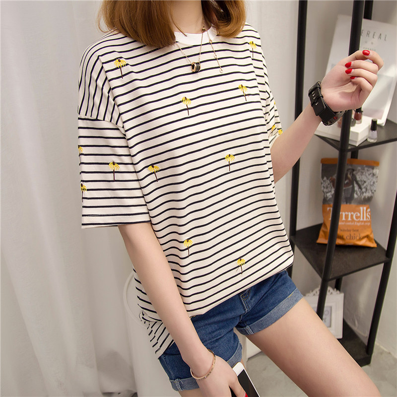 / 夏裝新款女裝條紋寬松t恤女中長袖韓版學生上衣女打底體恤衫