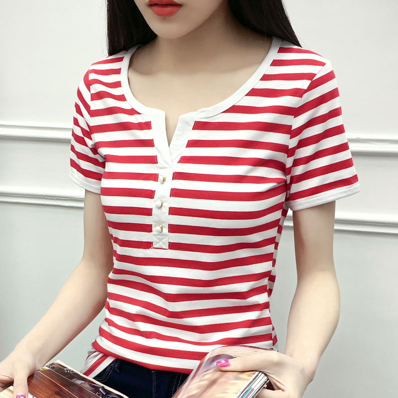 / 春夏新款大碼顯瘦條紋短袖t恤女打底衫上衣半袖體恤衫
