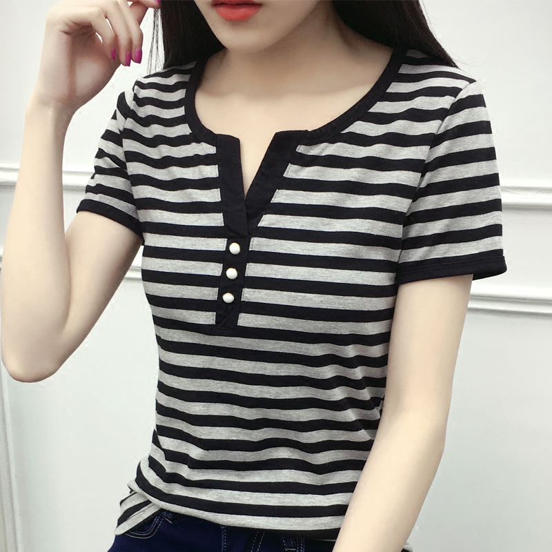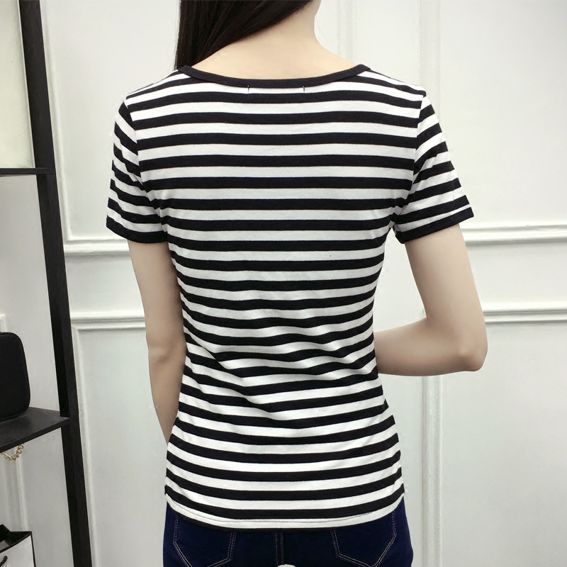 春夏新款大碼顯瘦條紋短袖t恤女打底衫上衣半袖體恤衫