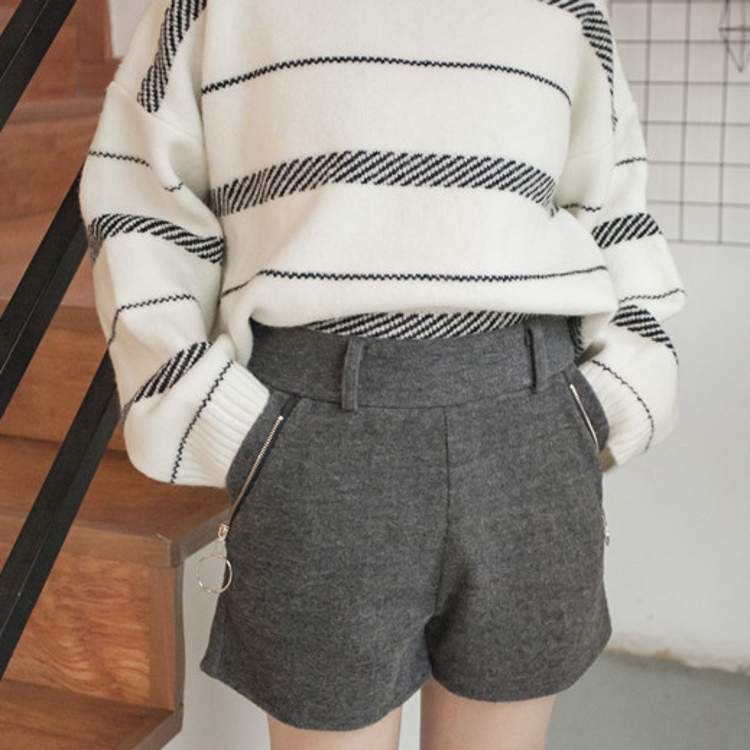 / 韓國chic秋冬款毛呢高腰顯瘦金屬圓環闊腿褲靴褲休閑短褲女