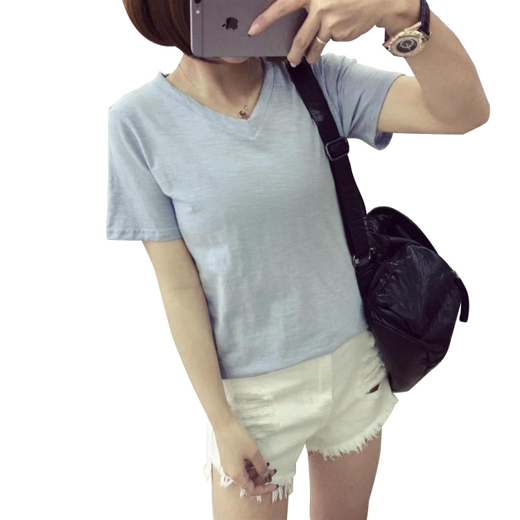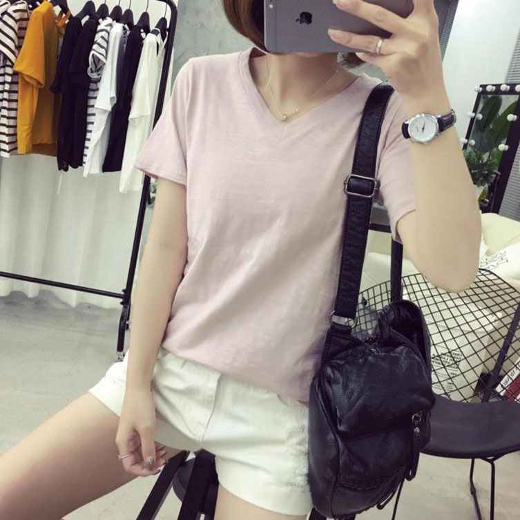 春夏季簡約白色竹節棉t恤潮學生休閑V領短袖上衣女修身純色體恤