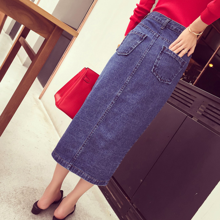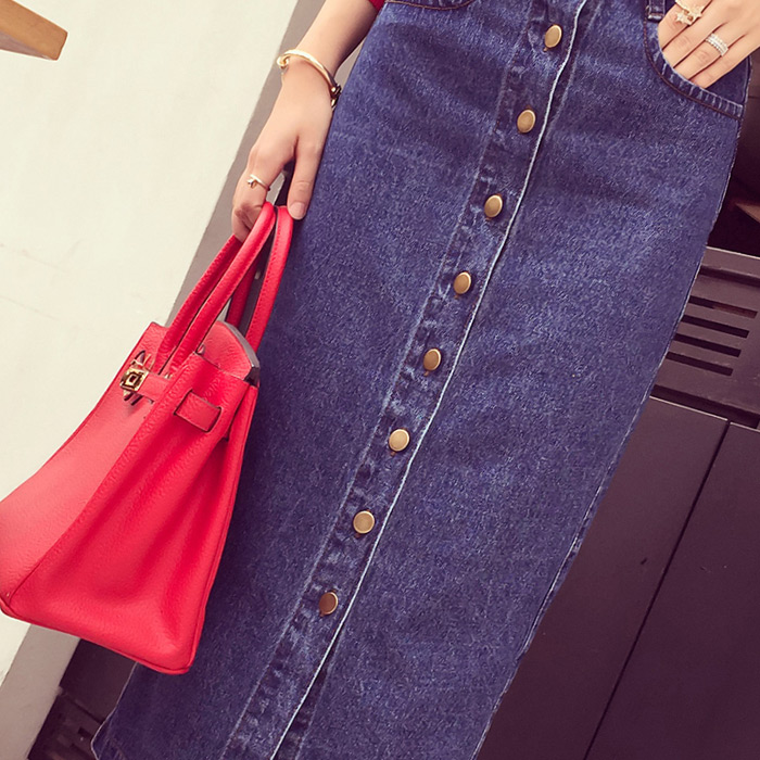 / 春季新款歐美范氣質單排扣設計高腰顯瘦牛仔包臀長裙半身裙女