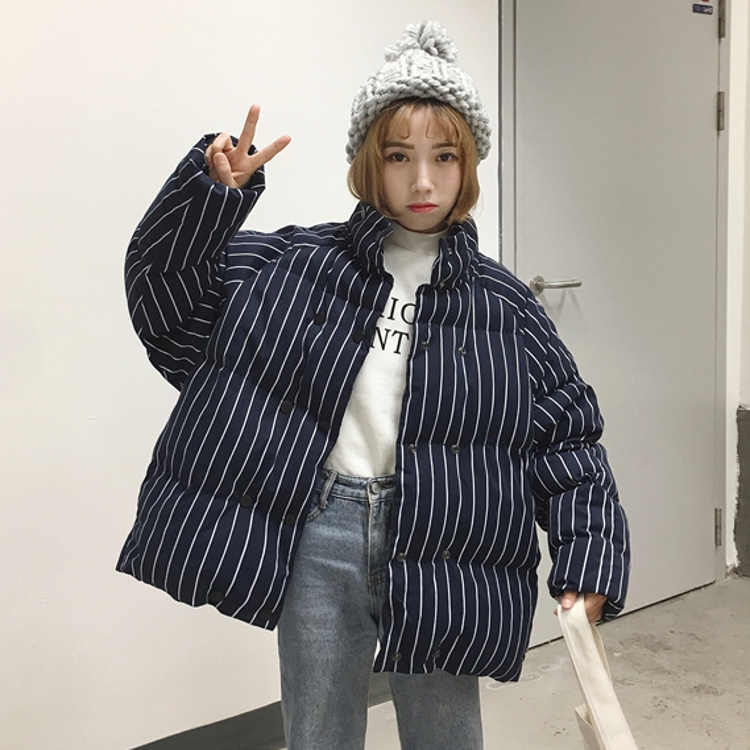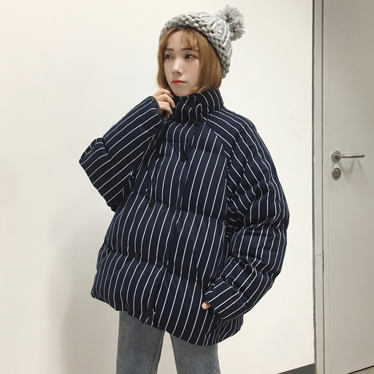 秋冬女裝韓版寬松加厚條紋面包服短款保暖立領棉服棉衣外套