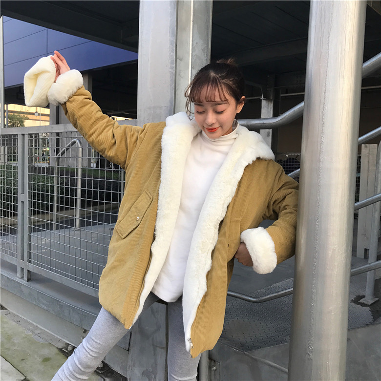 韓國冬款保暖加厚寬松中長款連帽燈芯絨學生棉服棉衣外套女