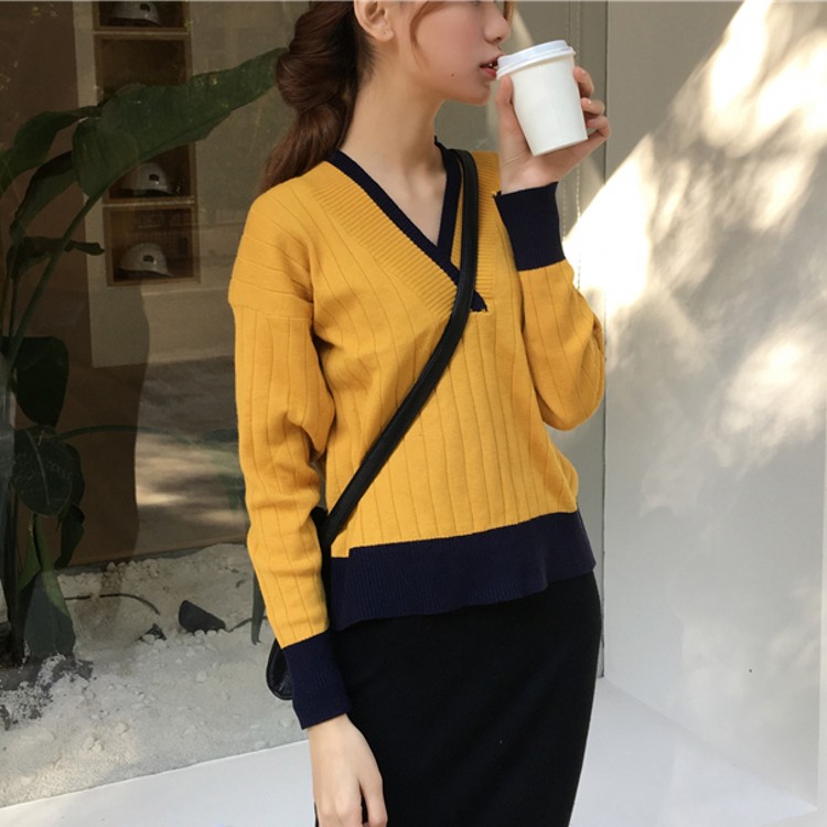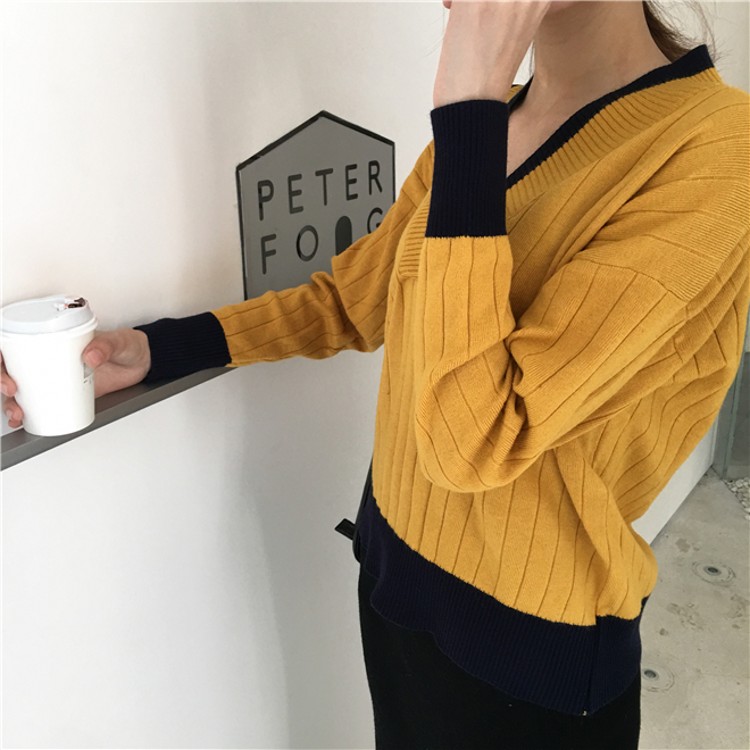 / 冬款韓國復古chic寬松v領套頭豎條保暖拼色百搭打底針織衫女