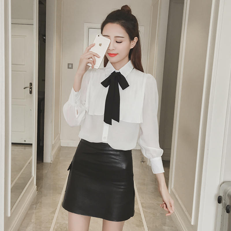 / 襯衫女長袖春裝新款女裝韓版蝴蝶結雪紡襯衣顯瘦百搭打底上衣