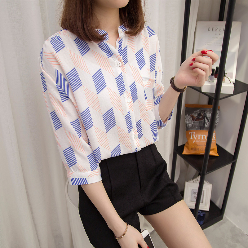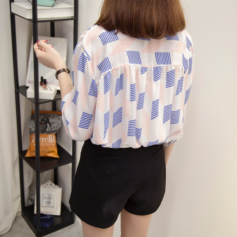 / 夏裝新款女小清新心機上衣拼色條紋襯衫女半袖韓范大碼白襯衣