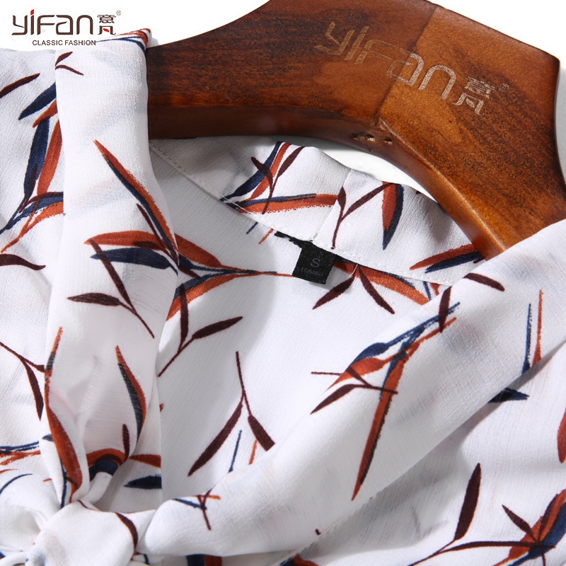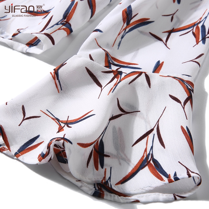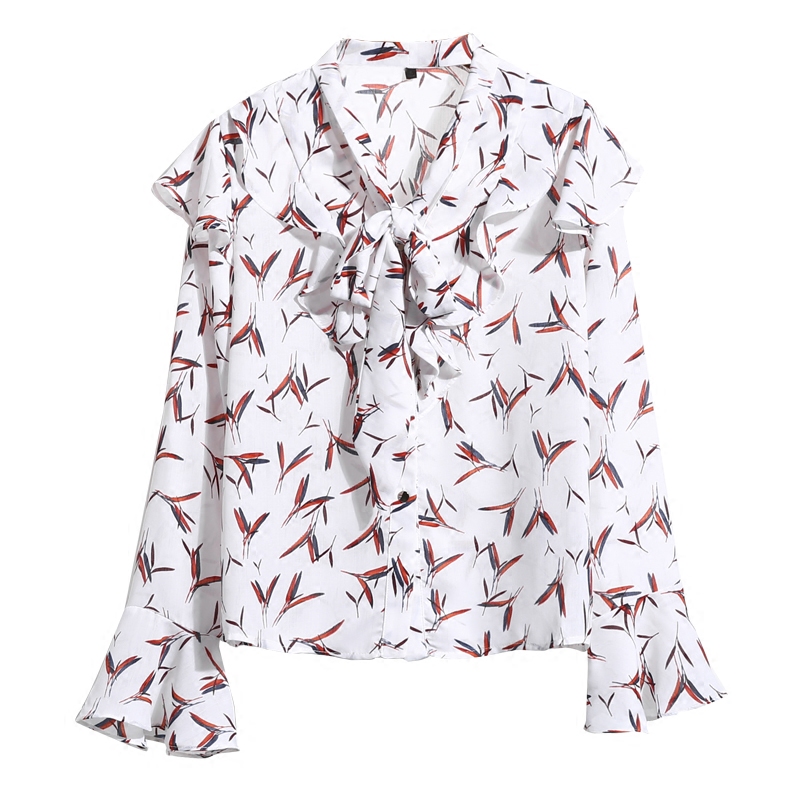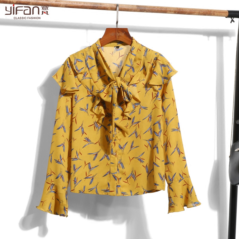 / 春夏長袖印花雪紡衫女裝蝴蝶結荷葉領寬松上衣韓版喇叭袖碎花襯衫