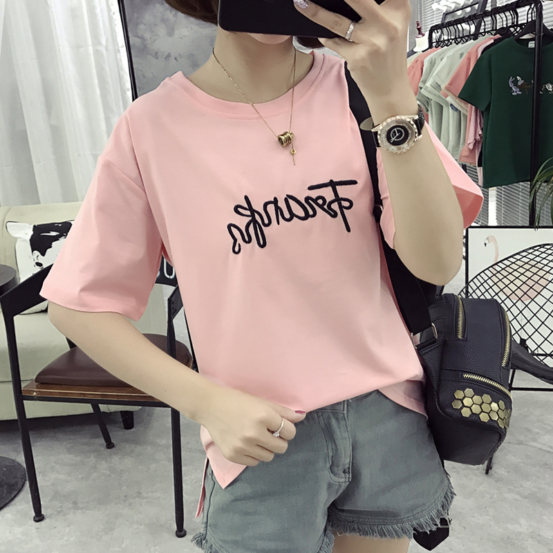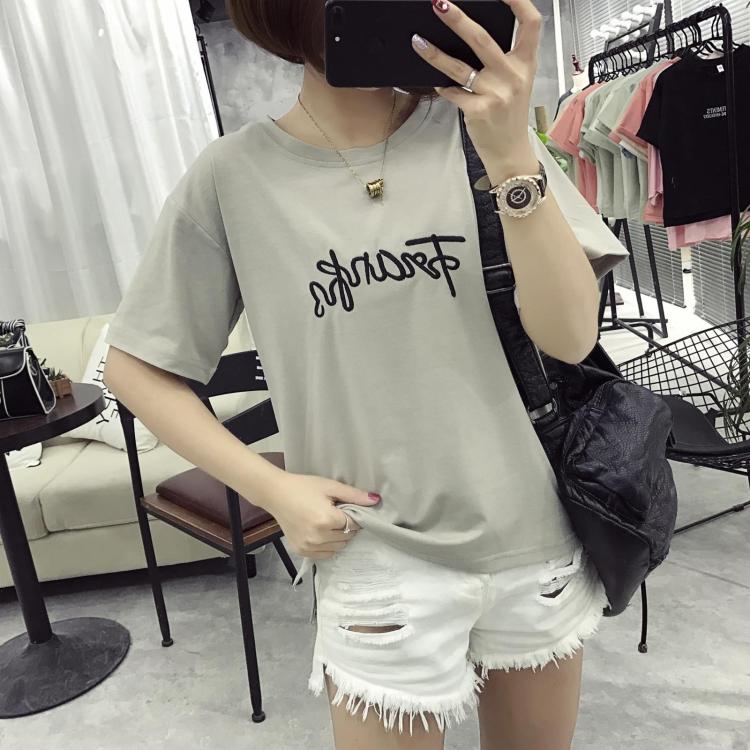 女裝寬松夏裝刺繡字母T恤女顯瘦打底上衣服簡約短袖t恤潮大碼