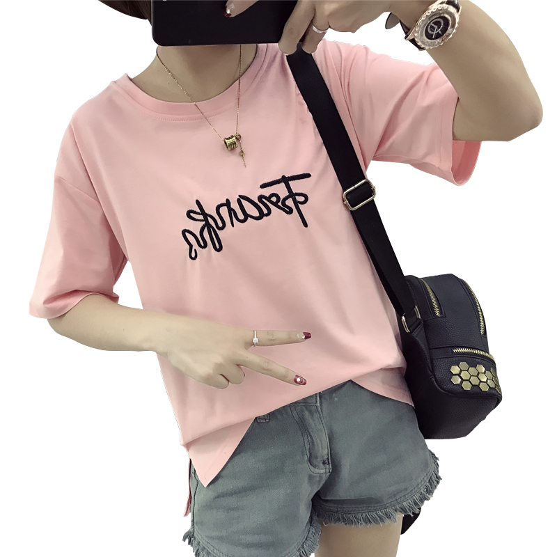 / 女裝寬松夏裝刺繡字母T恤女顯瘦打底上衣服簡約短袖t恤潮大碼