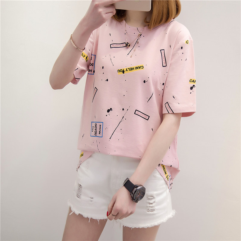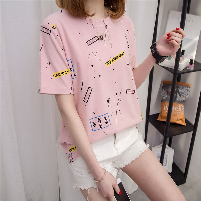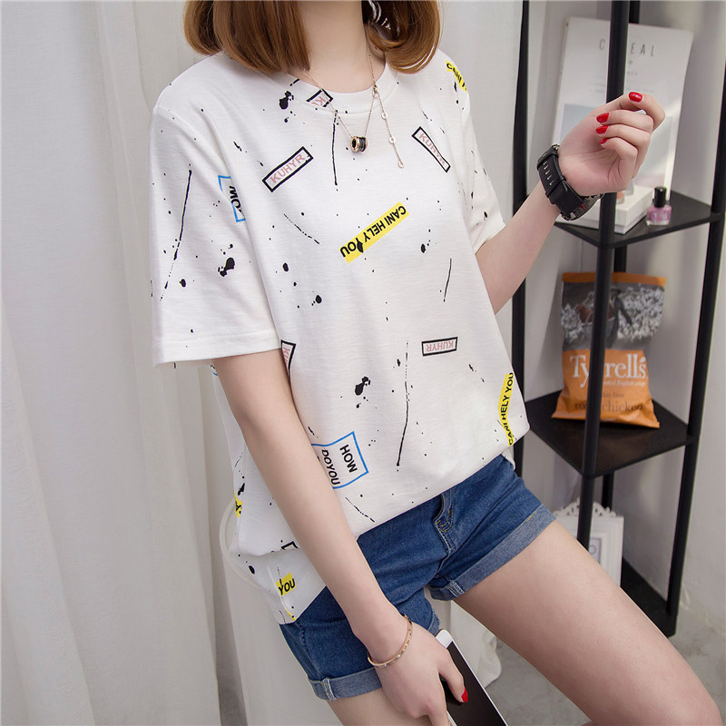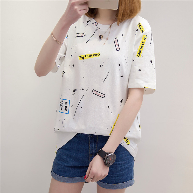 女裝春裝新款女上衣韓版潮涂鴉白色t恤女短袖打底寬松打底衫