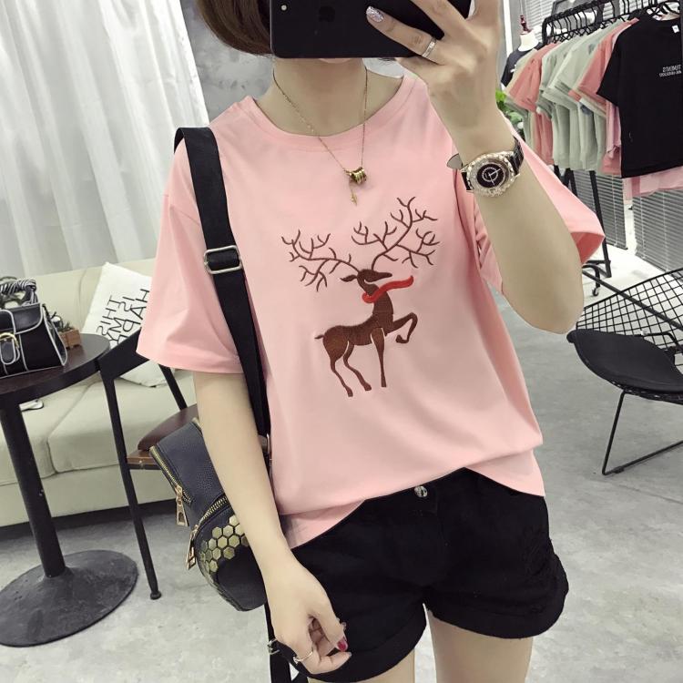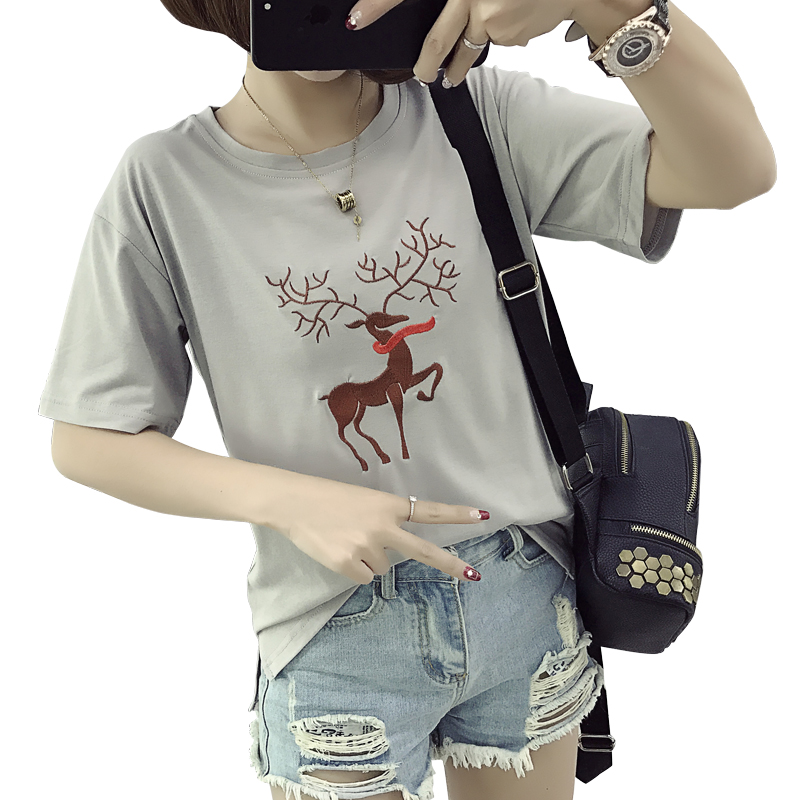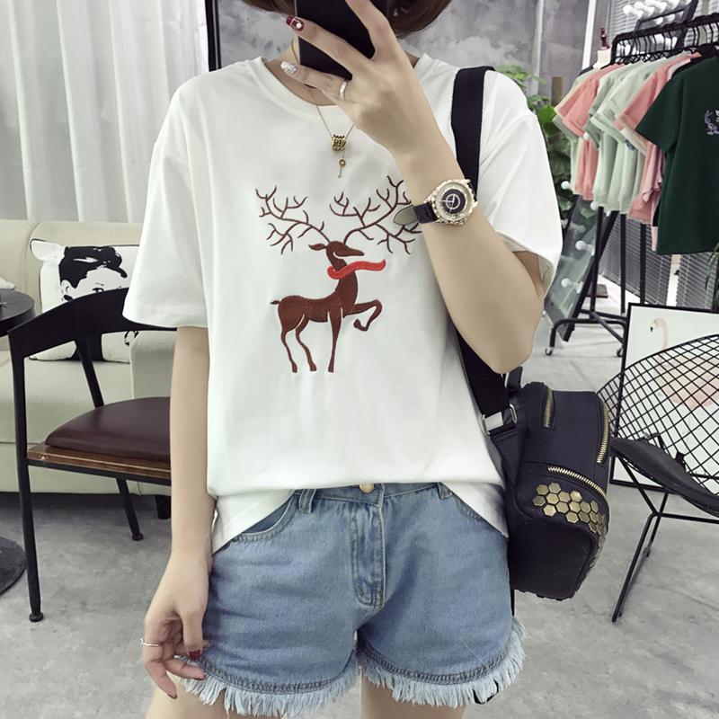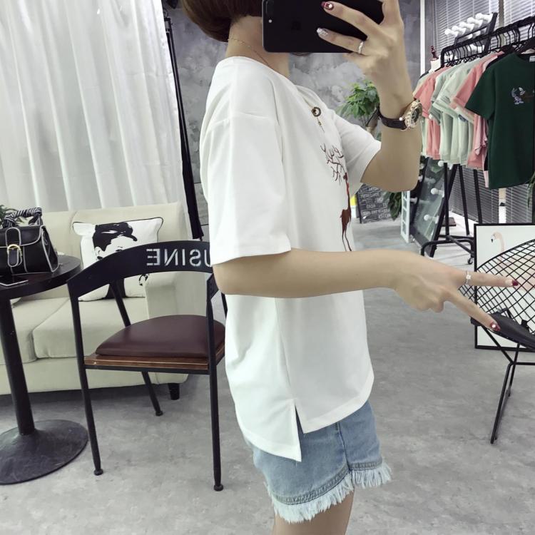 / 春夏裝韓版卡通刺繡體恤衫寬松夏季t恤女短袖潮前短后長大碼上衣