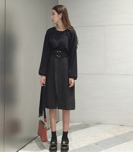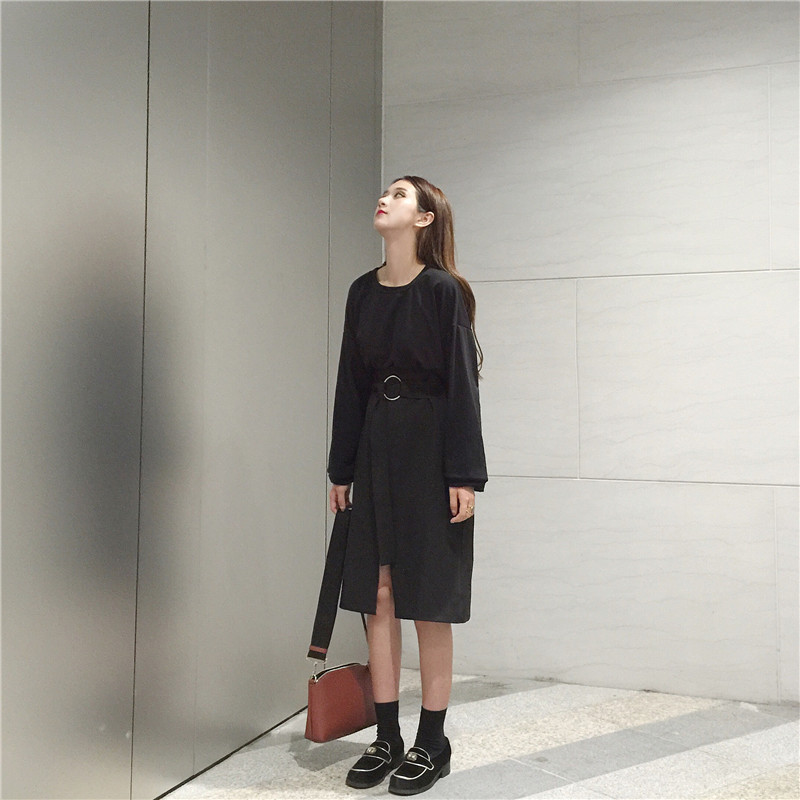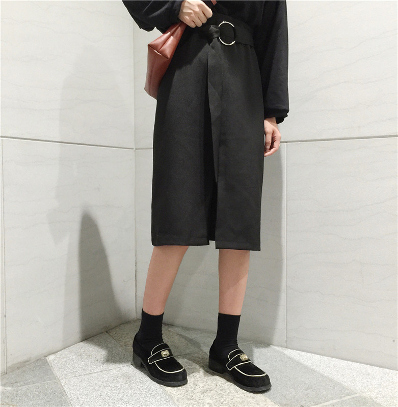 / 秋款韓國chic風百搭時尚休閑圓環綁帶開叉中長裙高腰顯瘦半身裙女