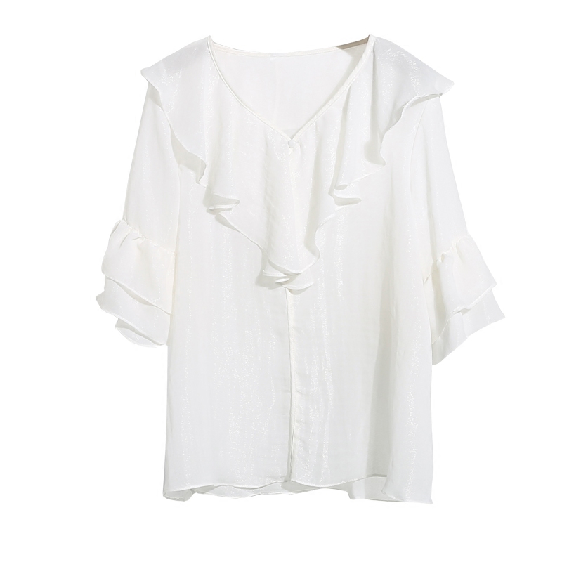 韓國東大門夏裝新品百搭荷葉邊V領雪紡衫女白色七分袖上衣潮