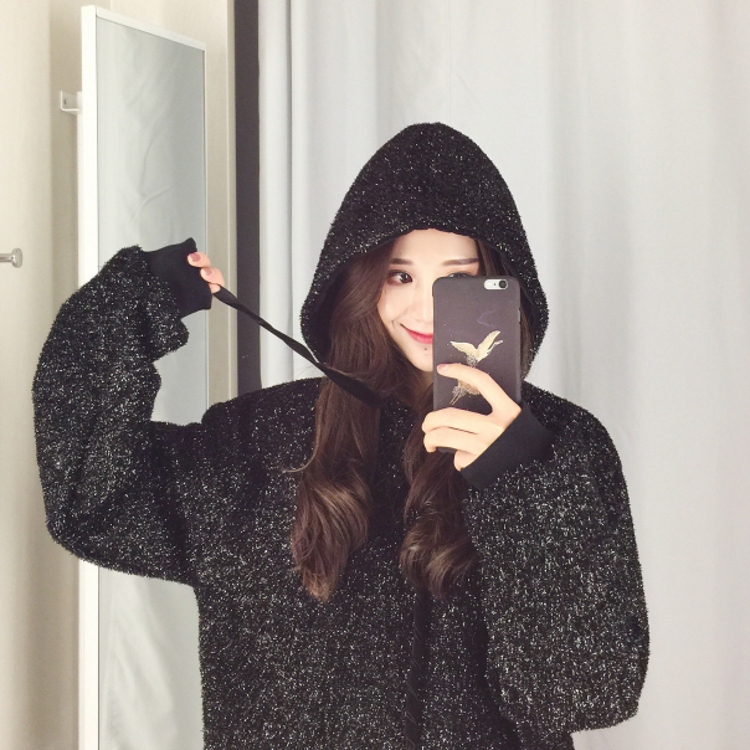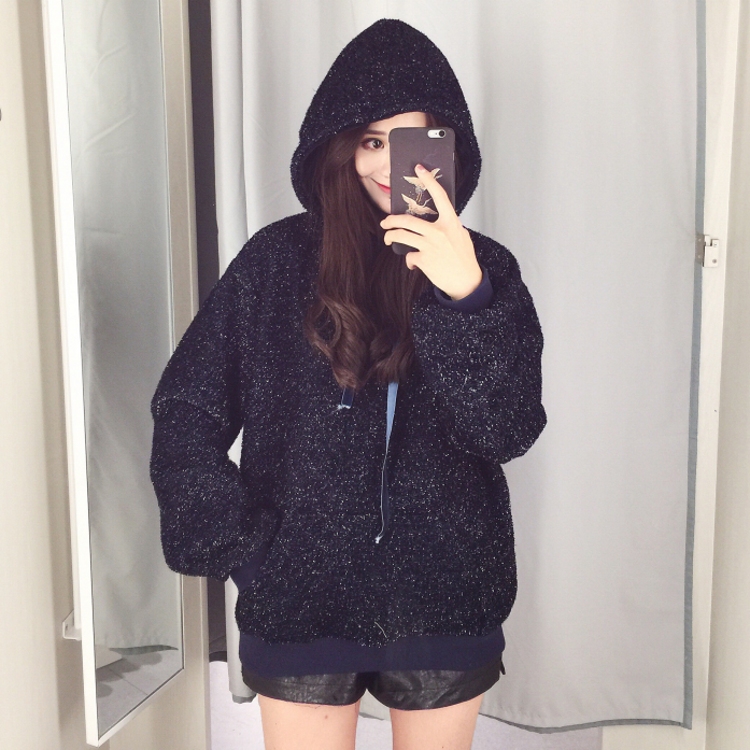/ 韓國chic秋冬款寬松百搭亮晶晶蝙蝠袖加絨套頭連帽衛衣女絨衫
