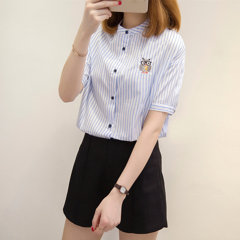 / 條紋襯衫女長袖小清新上衣女夏寬松半袖韓版bf風襯衣女百搭學生