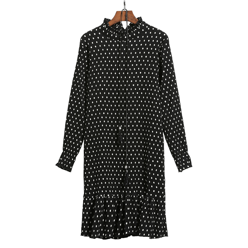 / 春夏雪紡波點中長款連衣裙套頭女裝長袖打底裙新款百褶裙
