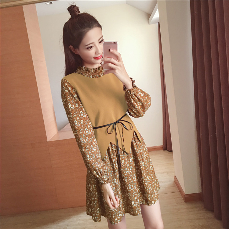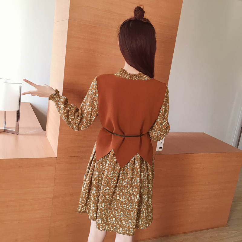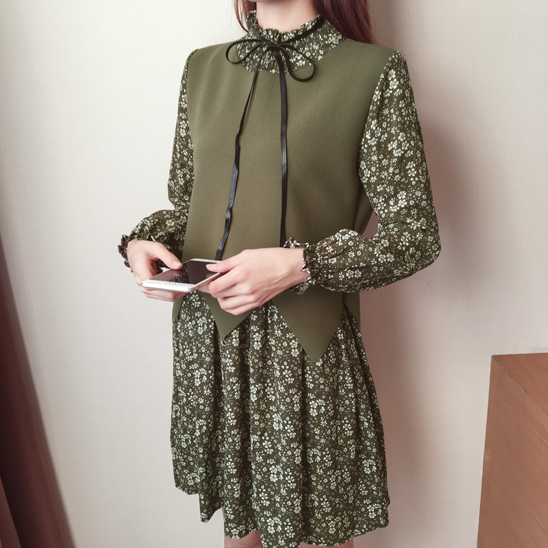 / 春新款女裝復古印花假兩件打底裙顯瘦長袖碎花雪紡連衣裙春秋
