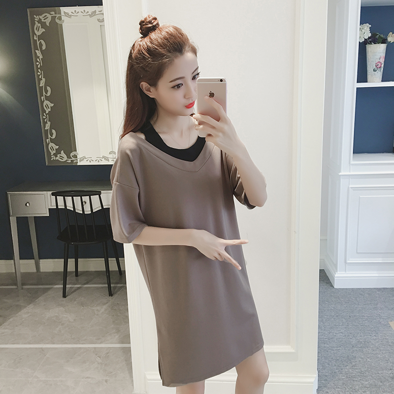 夏季新款女裝韓版中長款一字領T恤女短袖打底衫寬松露肩上衣