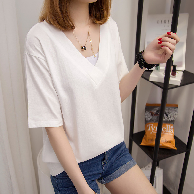 / 短袖t恤女寬松上衣女夏裝新款女裝白色韓版V領體恤衫打底百搭