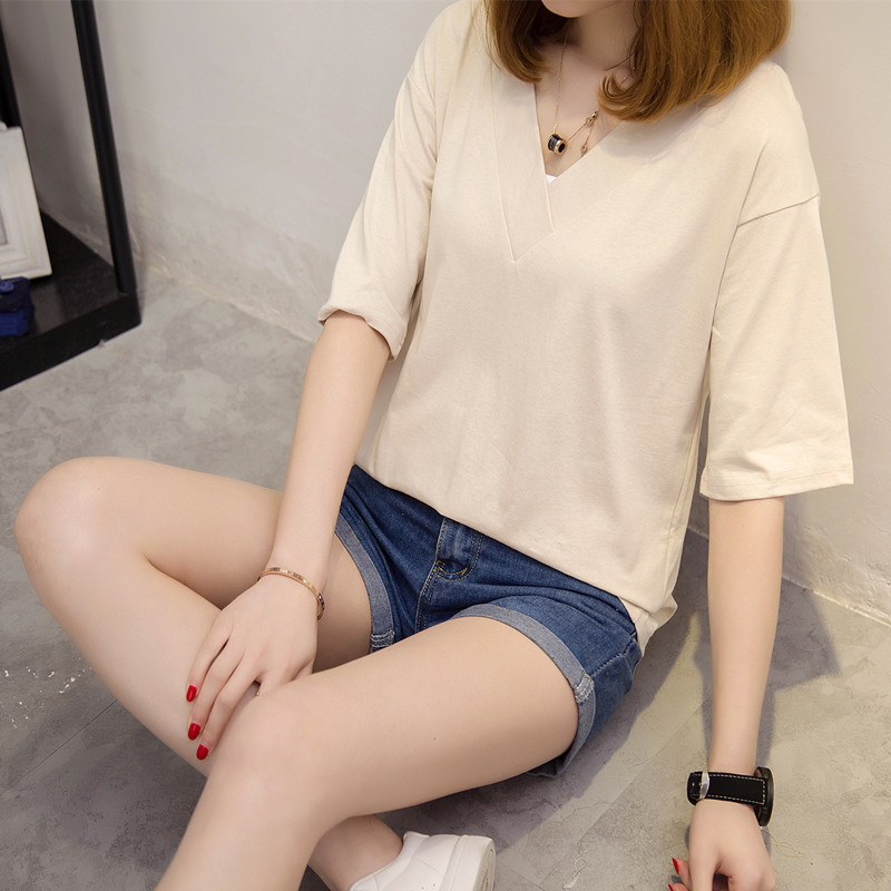 短袖t恤女寬松上衣女夏裝新款女裝白色韓版V領體恤衫打底百搭