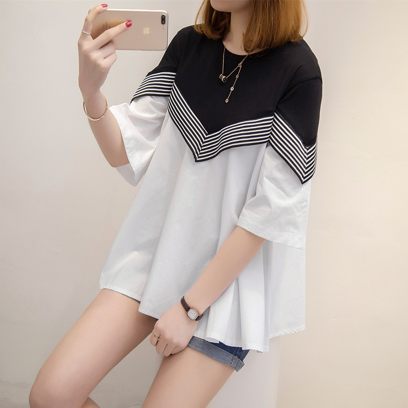 夏季衣服女裝韓版寬松拼接打底體恤衫新款春裝百搭中長袖上衣