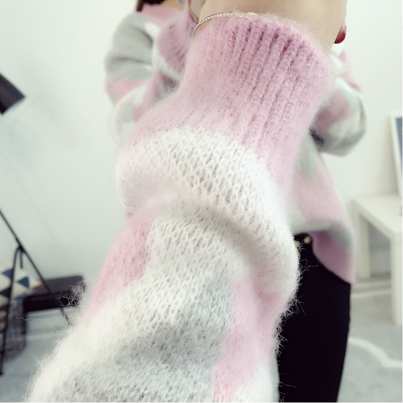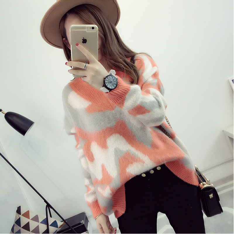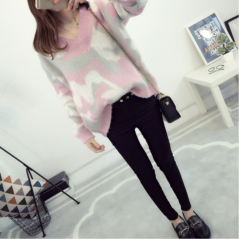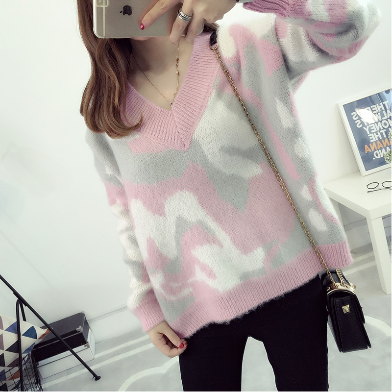 / 套頭毛衣女寬松韓版短款V領針織衫迷彩外套秋冬裝女裝新款潮