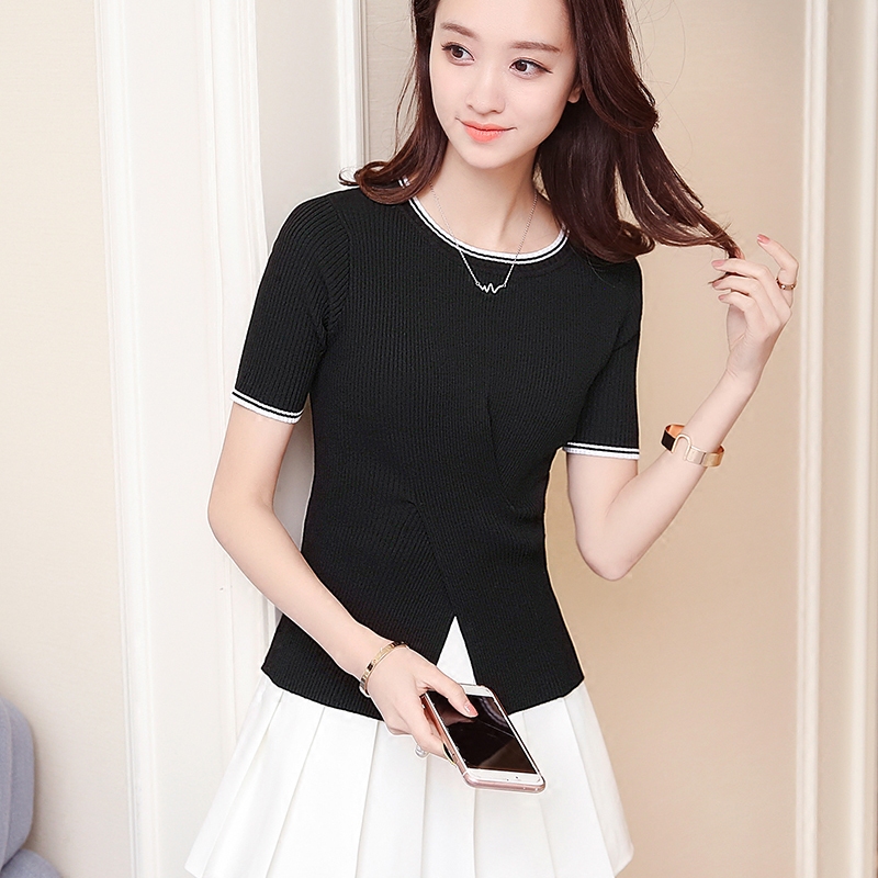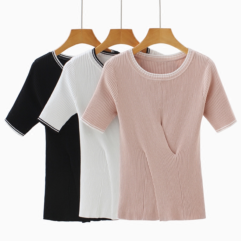 宜朵白色針織短袖女夏短款韓版修身百搭冰絲t恤上衣女薄款打底衫