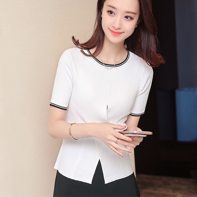 / 宜朵白色針織短袖女夏短款韓版修身百搭冰絲t恤上衣女薄款打底衫