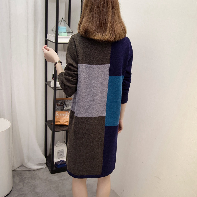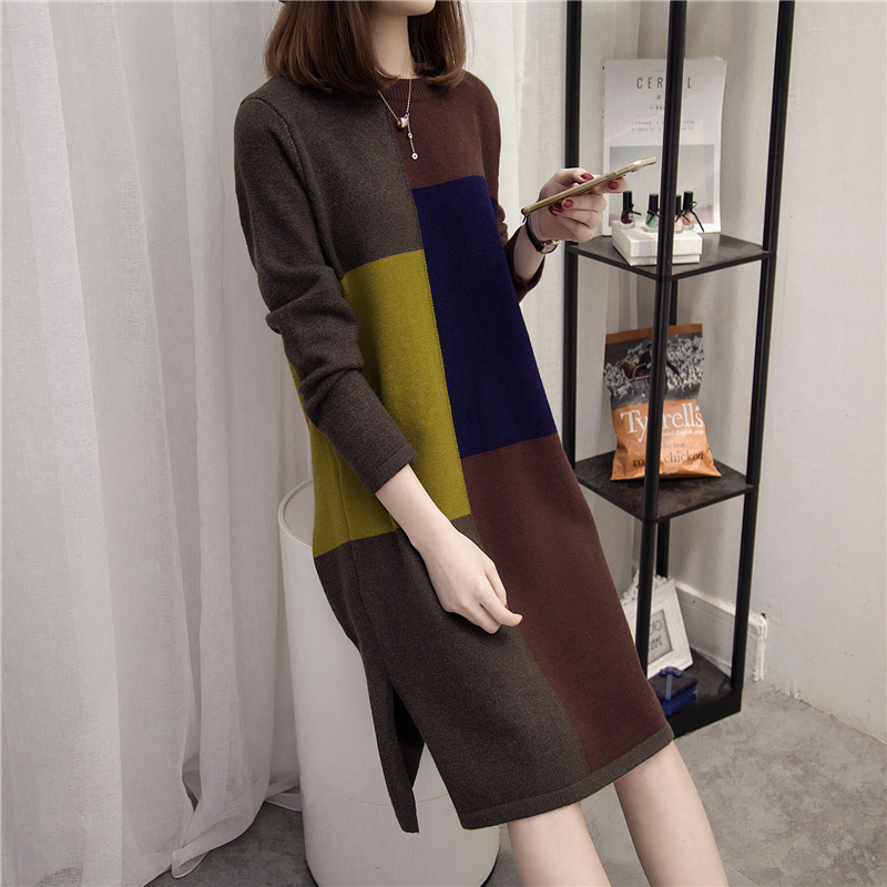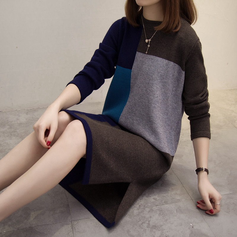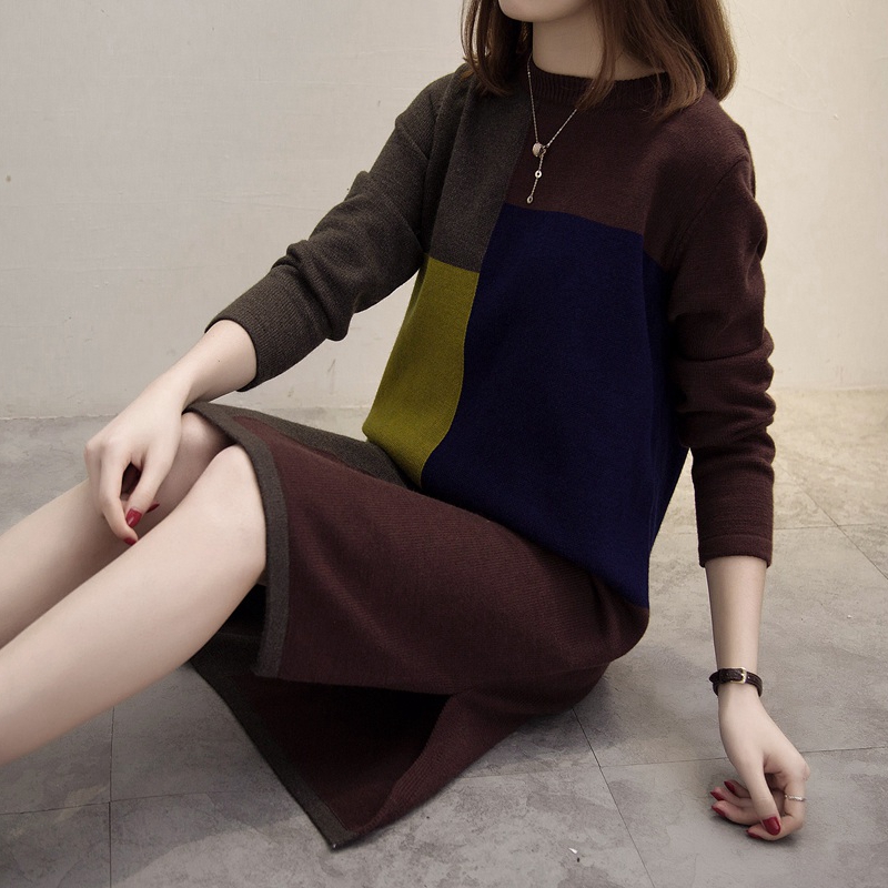 拼色針織衫秋冬女裝毛衣裙女套頭韓版中長打底衫上衣長袖寬松外套