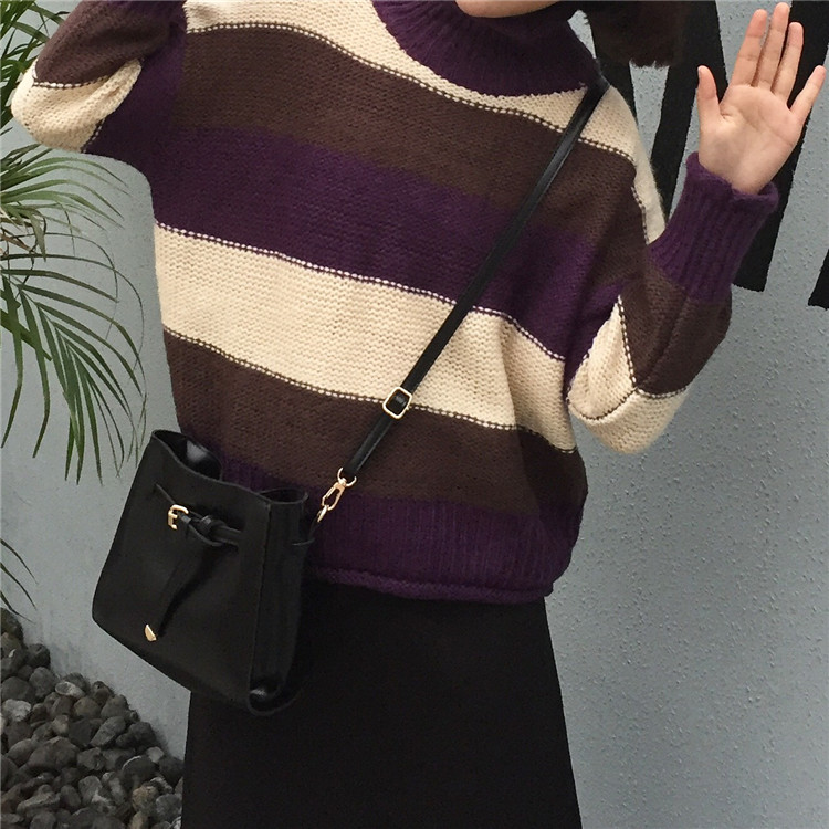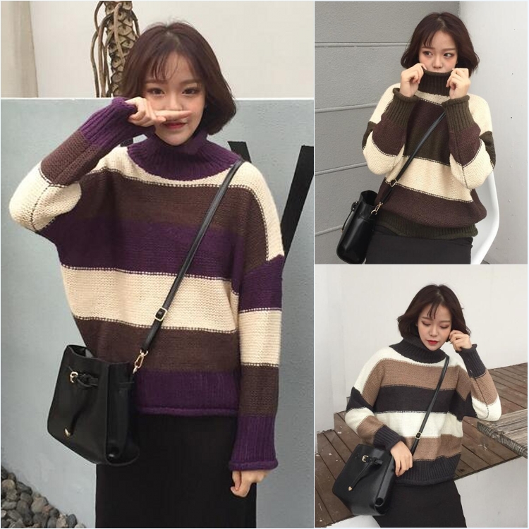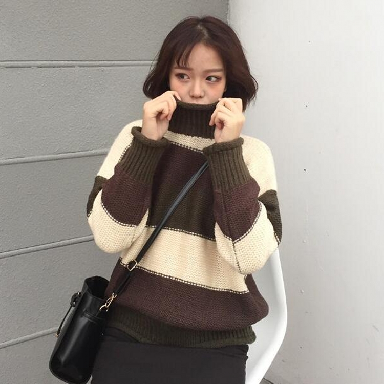 韓國chic秋冬款百搭簡約混色高領寬松套頭粗針學生毛線毛衣女