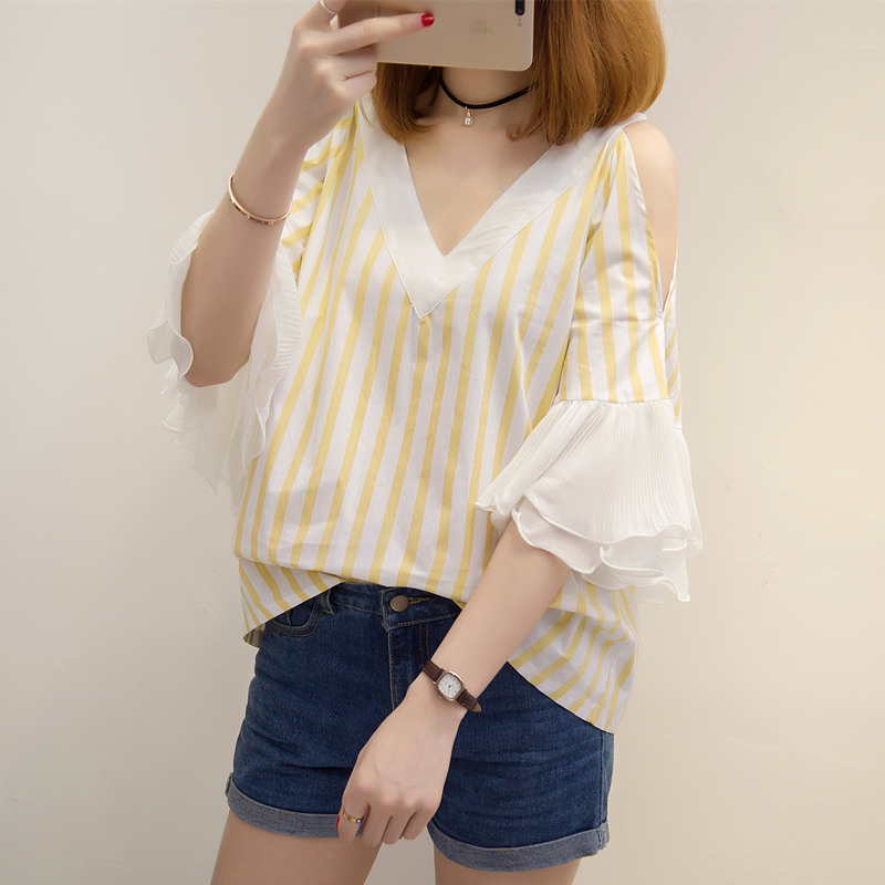 / 夏裝新款女荷葉袖露肩白t恤女半袖寬松條紋bf風小清新上衣女