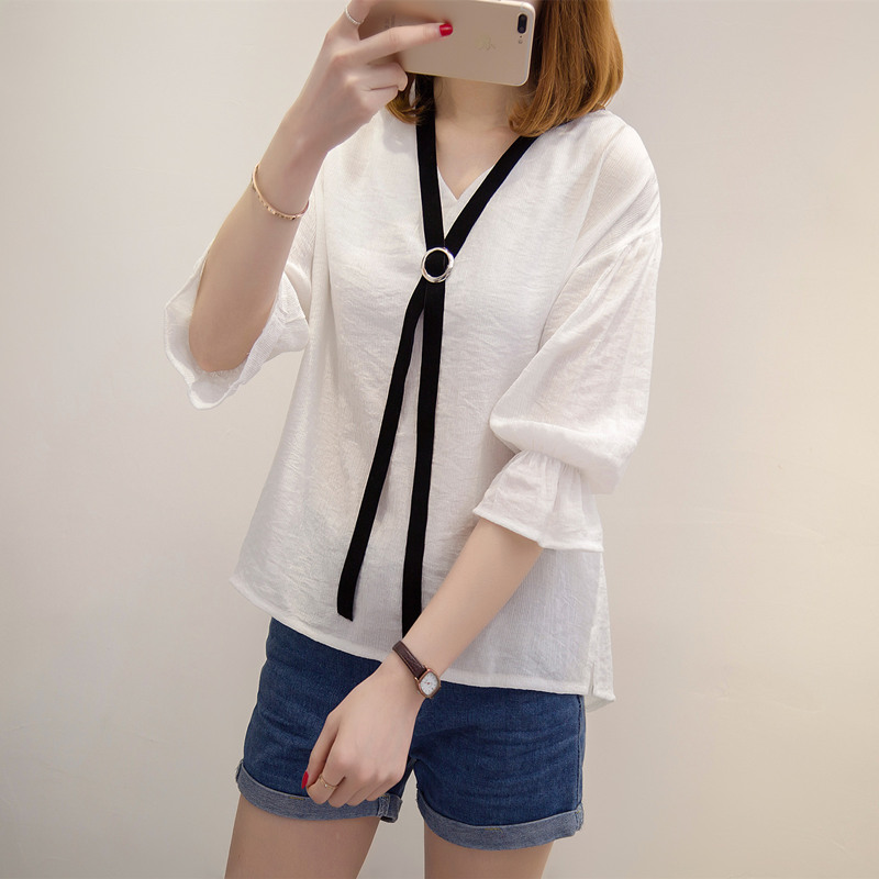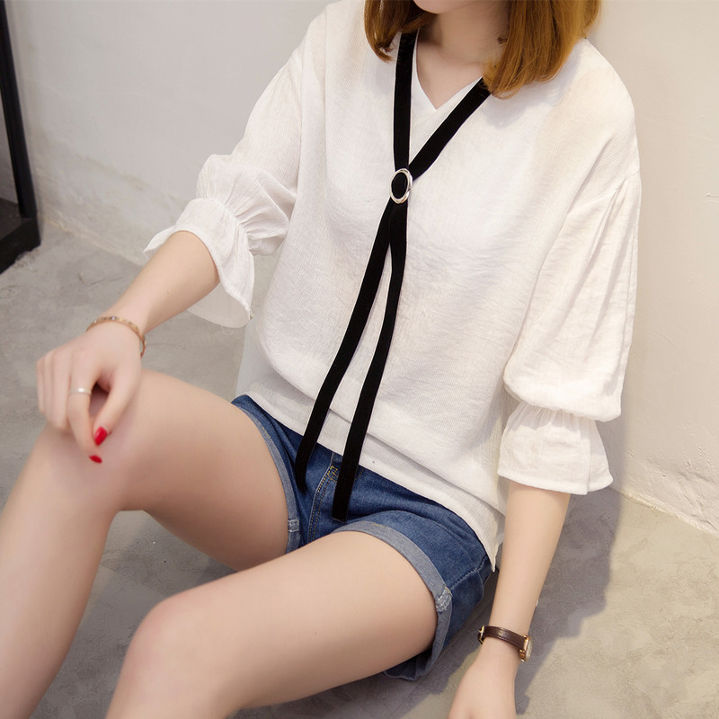 / 夏裝新款女裝韓版寬松荷葉袖打底體恤衫系帶春裝百搭女上衣潮