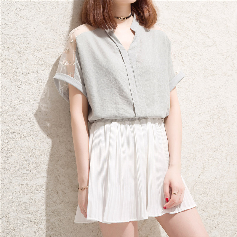 / 白色t恤女小清新露肩上衣bf風V領網紗寬松體恤短袖女夏裝新款