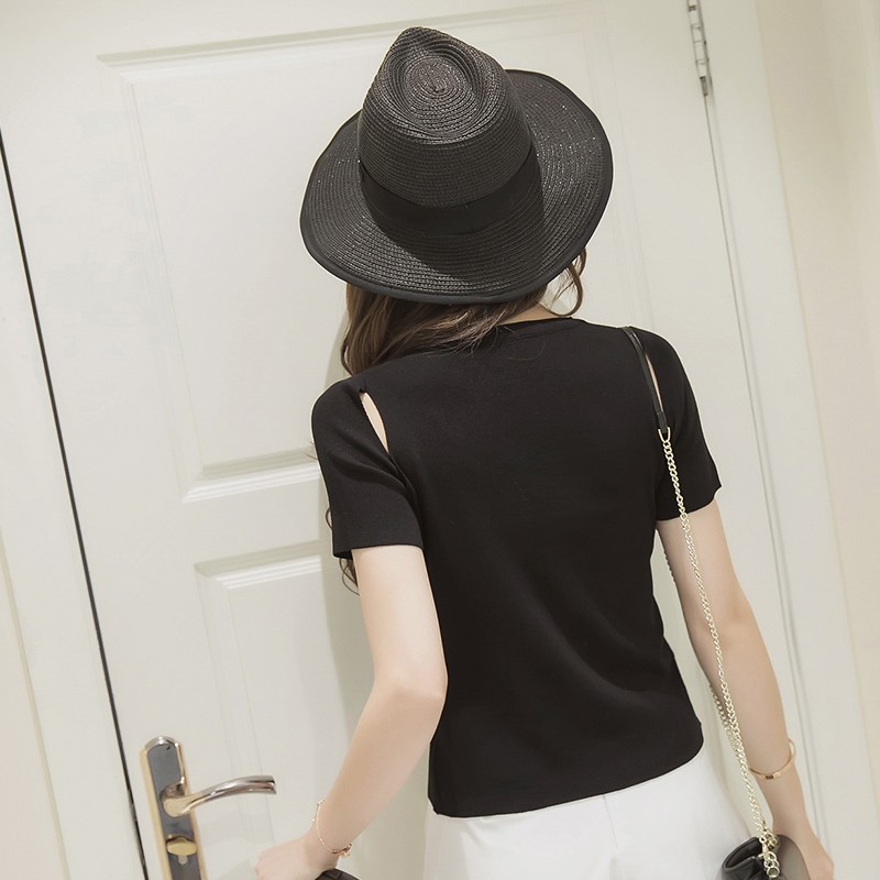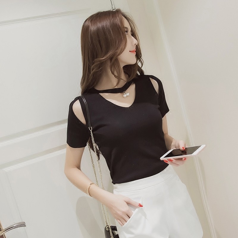 / 春夏韓版修身百搭鏤空掛脖V領漏肩針織衫女短袖T恤上衣打底衫