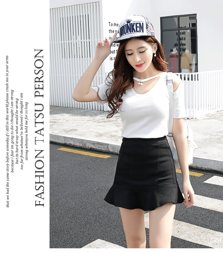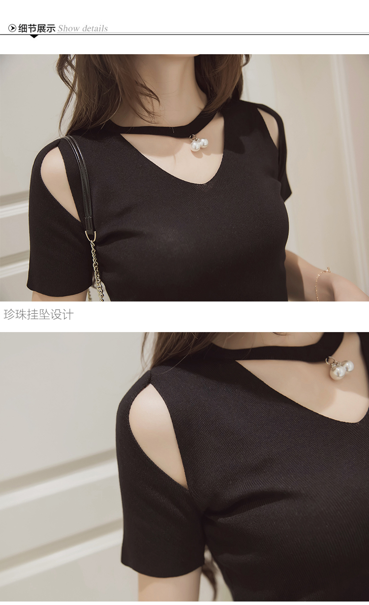 春夏韓版修身百搭鏤空掛脖V領漏肩針織衫女短袖T恤上衣打底衫