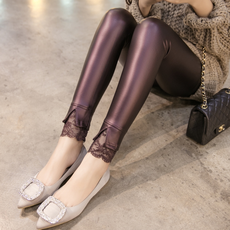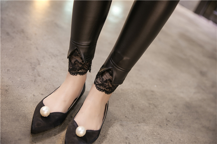 / 秋季新款韓版修身顯瘦彈力蕾絲小腳褲PU皮長褲皮褲黑色打底褲女潮