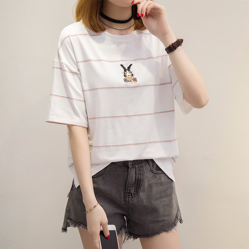 白色條紋t恤女小清新心機上衣刺繡韓版體恤衫短袖衣服女夏裝