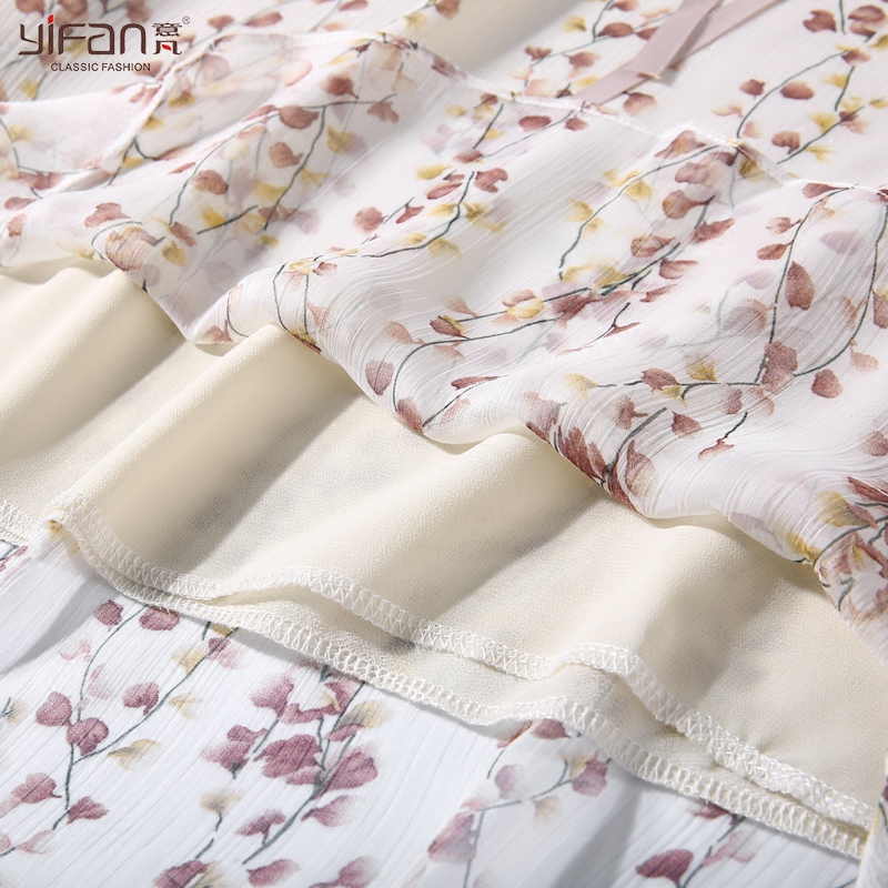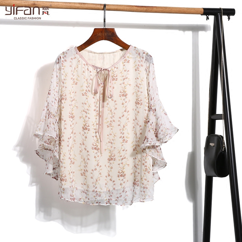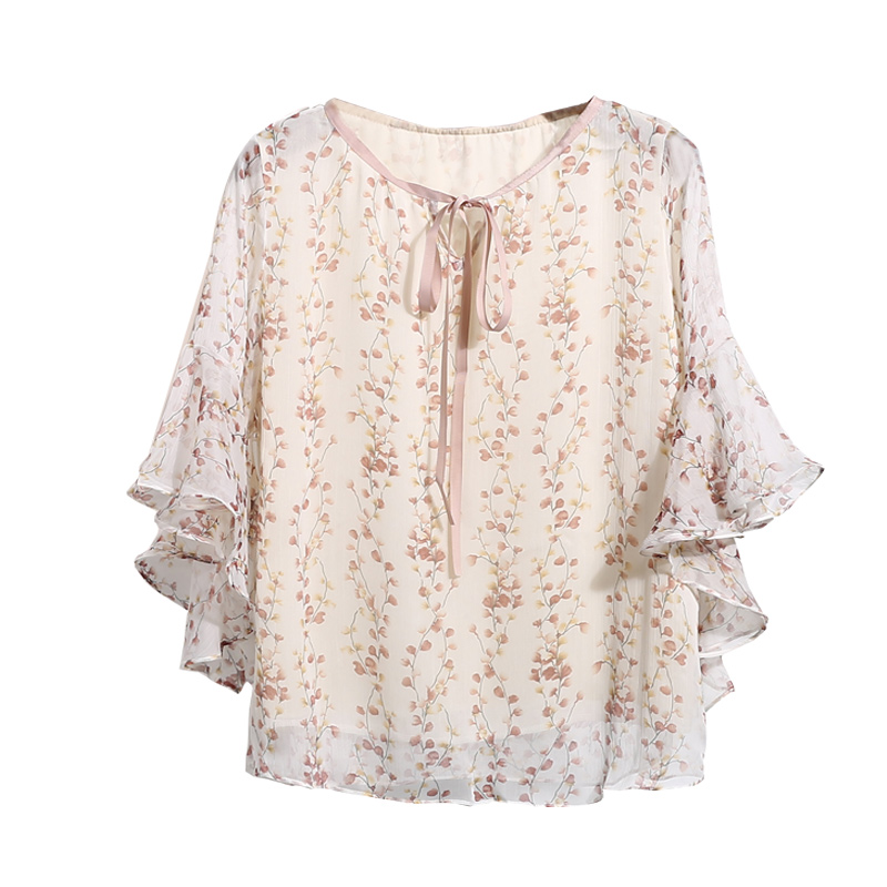 / 喇叭袖雪紡上衣女夏季新款韓版甜美七分袖系帶荷葉邊碎花小衫