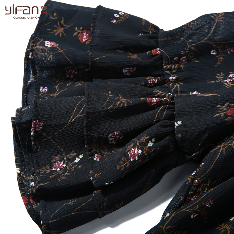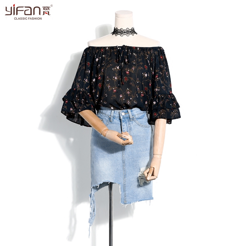 / 夏季新款一字領露肩荷葉邊印花雪紡衫女蝴蝶結喇叭袖碎花上衣