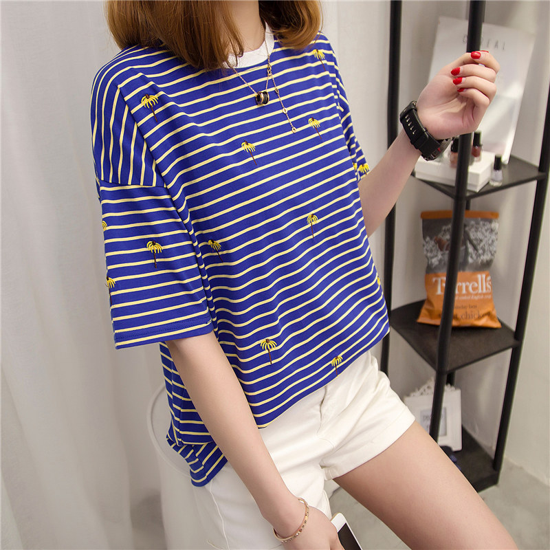/ 女裝春裝新款潮條紋短袖t恤女寬松上衣韓版體恤夏裝學生百搭