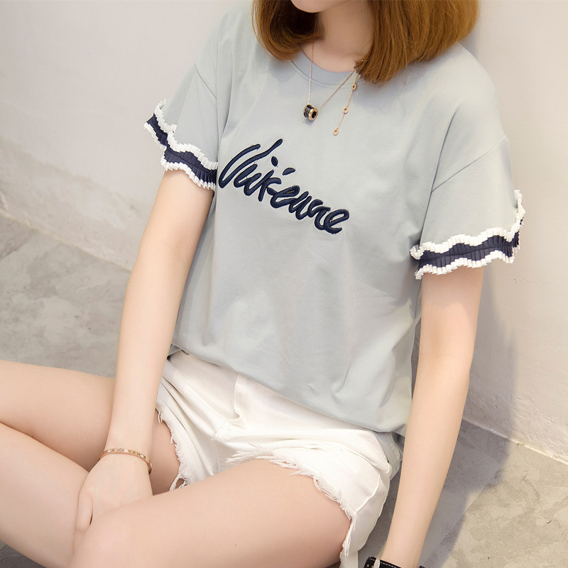 / 女裝夏裝新款韓版潮寬松字母百搭上衣女圓領短袖體恤衫打底衫