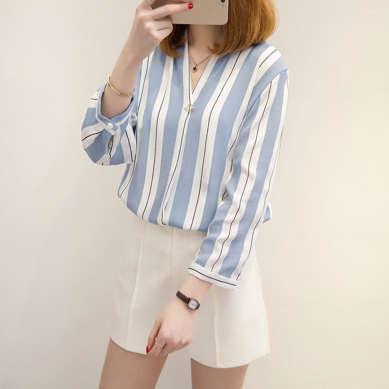 條紋襯衫女V領韓風chic小清新上衣白襯衣女長袖夏裝新款韓范