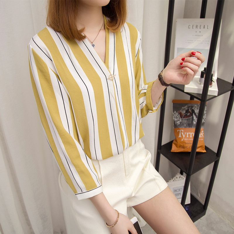 / 條紋襯衫女V領韓風chic小清新上衣白襯衣女長袖夏裝新款韓范